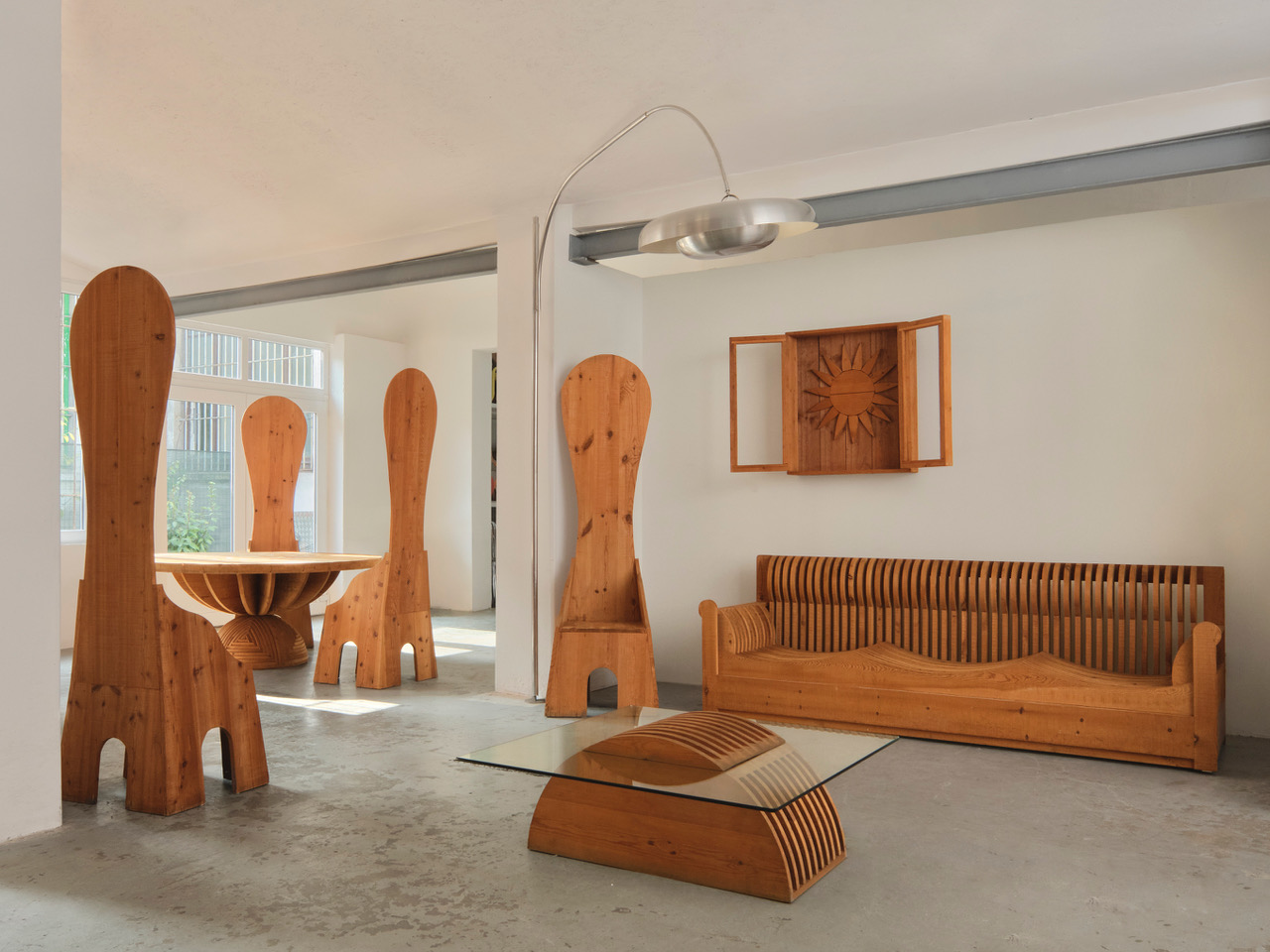 Le forme ideate da Ceroli poi giocano sul continuo richiamo all’arte antica così come alla cultura pop: sono oggetti che rimandano a un qualcosa che si conosce già, accrescendo così il senso di confusione metafisica di chi li guarda. Le sedie a spalliera sono il mobile che più ricalca l’immaginario dechirichiano, nelle loro forme allungate si possono riconoscere i manichini tanto cari al pittore greco. Ci sono poi un tavolino basso con un piano in vetro e due tavoli con una decorazione che riproduce una rosa dei venti da cui emerge una sacralità di proporzioni simile a quella del mondo classico o medievale, in cui si riconosce anche l’abilità tecnica dell’artigiano che costruisce mobili in cui la levigatura del legno e il suo perfetto incastro sono fondamentali. Infine le cassettiere, i divani e la poltrone presentano giochi di pieni e di vuoti dove la materia lignea vibra e il letto, con la sua decorazione antropomorfa, richiama i grandi arredi antichi. In mostra anche una scultura in legno che rappresenta un sole fuori dalla finestra, un gioco in cui verità e finzione si incontrano.