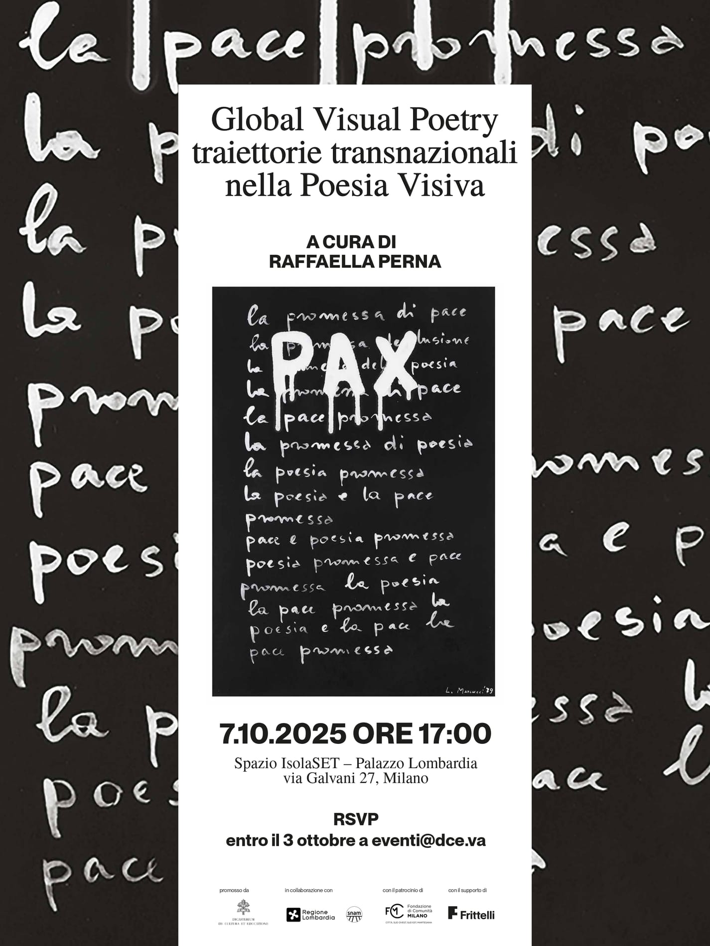 Milano, 6 ottobre 2025. Palazzo Lombardia – IsolaSET di Milano ospiterà dal 7 al 31 ottobre la mostra Global Visual Poetry: traiettorie transnazionali nella Poesia Visiva, promossa dal Dicastero per la Cultura e l’Educazione della Santa Sede, in collaborazione con Regione Lombardia, con il contributo di Snam e con il patrocinio della Fondazione di Comunità di Milano.