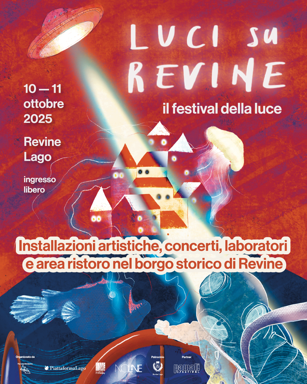 “Luci su Revine” nasce all’interno di Piattaforma Lago ed è sviluppato dalla Pro Loco di Revine Lago in collaborazione con No-Line, con la direzione artistica di Filippo Meneguz (alias Filwood Filosophy) e la direzione tecnica Nevio De Conti. Operativamente, l’organizzazione è sostenuta dalla Pro Loco di Revine Lago, che da anni lavora per promuovere e trasformare il borgo attraverso la cultura, mentre il progetto gode del patrocinio e del supporto del Comune di Revine Lago. L’idea prende forma dall’esperienza maturata negli ultimi anni con le installazioni luminose del Lago Film Fest: «Negli ultimi anni ho lavorato con la luce per cambiare la percezione degli spazi e raccontare nuove storie durante il festival» – spiega Filippo Meneguz. «Con Luci su Revine abbiamo deciso di fare un passo in più: creare un evento interamente dedicato alla luce in tutte le sue sfaccettature, portando installazioni che sorprendono e coinvolgono, capaci di far scoprire il borgo con occhi nuovi». Ad animare il percorso luminoso ci saranno gli interventi di Elena Uliana, Enrico Antonello, Pj Slis, Plam Studio, Filwood Filosophy, Elisa Barbieri, Furio Ganz, Edoardo Ongarato, Formula Lumen, Cinzia Tomasi, Mattia Gardenal, Michele Pietravalle, Xi Lin, con opere che spaziano tra light design, arte digitale, installazioni site-specific, video mapping e sperimentazioni sonore. Il programma di Luci su Revine - che è un evento ad ingresso gratuito - unisce momenti di esplorazione artistica, convivialità e scoperta del borgo. Le serate prenderanno vita all’ora dell’aperitivo con l’apertura dell’area food dedicata ai prodotti locali, per poi accendere le luci al calar del sole. Venerdì 10 ottobre, dopo l’inaugurazione ufficiale e l’accensione delle installazioni, il pubblico potrà partecipare a un talk aperto intitolato Spazi in relazione, che metterà in dialogo arte contemporanea, paesaggi e comunità, e contemporaneamente partire con i primi tour guidati alla scoperta delle opere e degli artisti. La serata continuerà con il concerto di pianoforte e flauto del duo Andrea Tessarotto e Eugenio Migotto e con il djset Estatica | Selecta di Ettore(It) e Cesco fino a mezzanotte.
