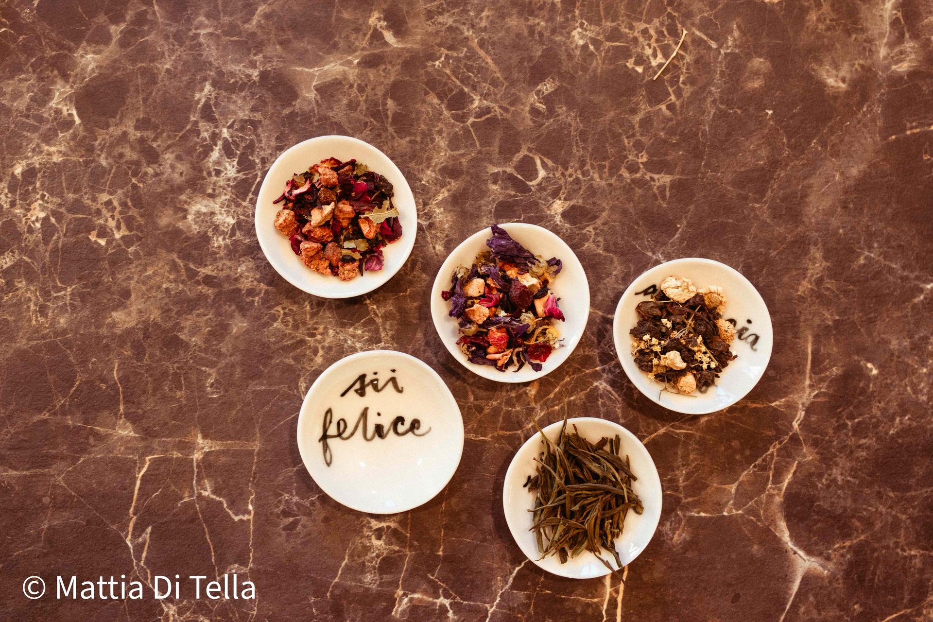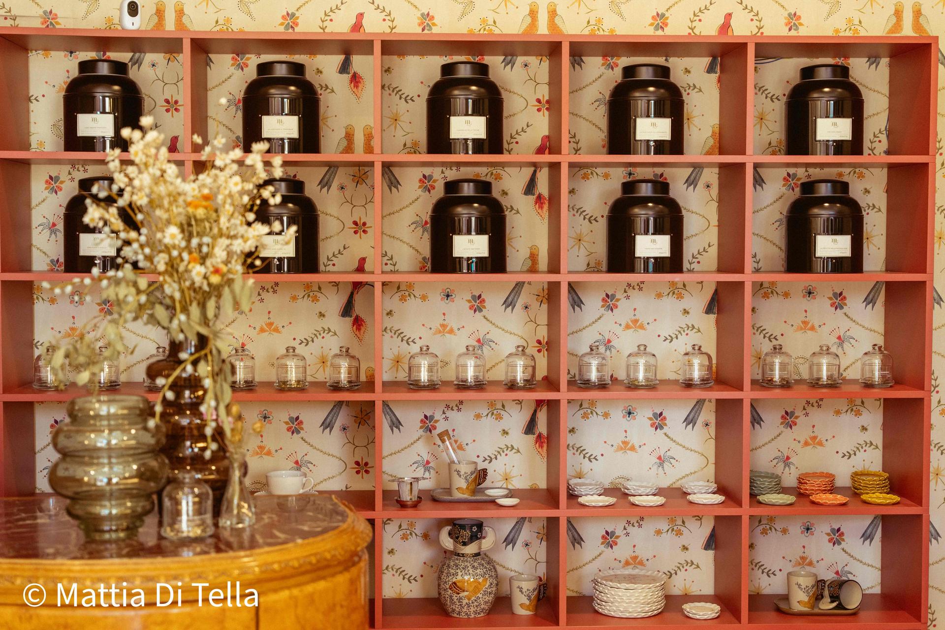 Il progetto d’interni, firmato da Paola Podenzani, coniuga calore e raffinatezza. Su una superficie di 150 metri quadrati, lo spazio si articola su due livelli: al piano terra il banco e la boutique di tè, infusi, tisane e concept store con regali per momenti felici, con un bancone vintage restaurato che dona atmosfera, eleganza e un tocco di classe senza tempo, armonizzandosi con l’ambiente accogliente e raffinato; al piano superiore la sala dei tè, la stanza dei dolci e la sala eventi con tavolo conviviale. Toni caldi come verde lichene e terracotta, luci soffuse, profumi naturali e suoni ambientali creano un’atmosfera rilassante. Materiali materici, velluti e tavoli evocano una casa elegante e accogliente, un luogo dove il tempo rallenta davvero.