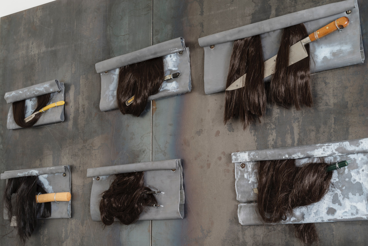 In Kounellis, questa tensione si manifesta attraverso un’estetica della materia che incorpora gli oggetti del lavoro, i materiali poveri, gli elementi primari: ferro, carbone, lana, sacchi di iuta, fiamme. La sua è una liturgia laica, anzi materialista, un rito tragico in cui il dolore del mondo trova espressione nella materia stessa. Alla Galleria Fumagalli sono esposte alcune delle sue opere, strutture in ferro su cui poggiano ora sacchi pieni di carbone, ora cappotti compressi, ora capelli trafitti da lame: oggetti veri che portano la traccia dell’esistenza umana, della sua quotidianità e delle sue fatiche.