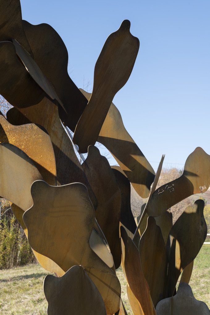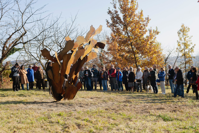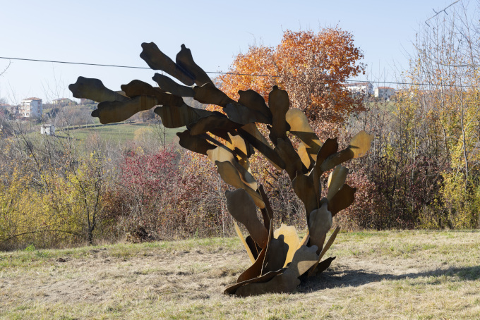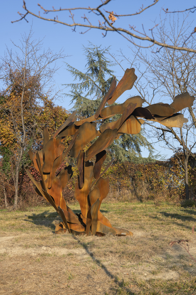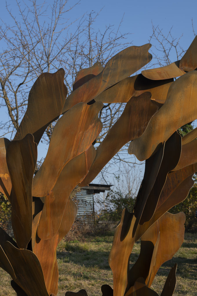 Le sagome in acciaio corten, con le loro superfici ossidate e i profili irregolari, ricordano anche foglie agitate e sostenute dal vento, frammenti di un’umanità che si muove, si disperde e si ritrova nel ciclo vitale della natura. In questo dialogo tra materia, ambiente e memoria, la scultura di D’Oria si fa presenza viva, forte eppur leggera, proiettata verso uno spazio e un tempo nuovi eppur saldamente radicata nel qui e ora, quasi un arbusto vivo che ha voluto nascere proprio lì, per radicare in profondità e poi espandersi in una diaspora che porterà frutti.