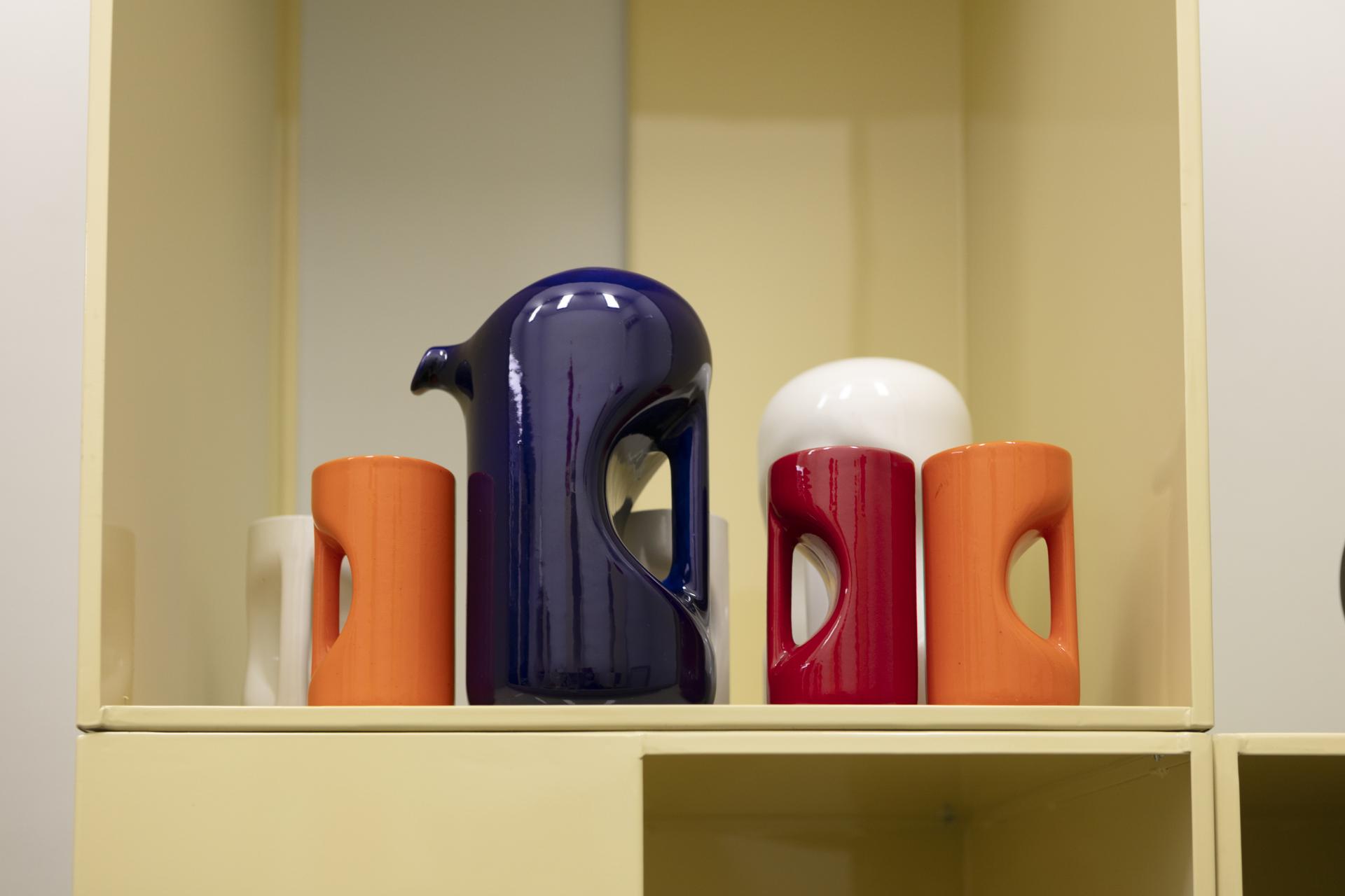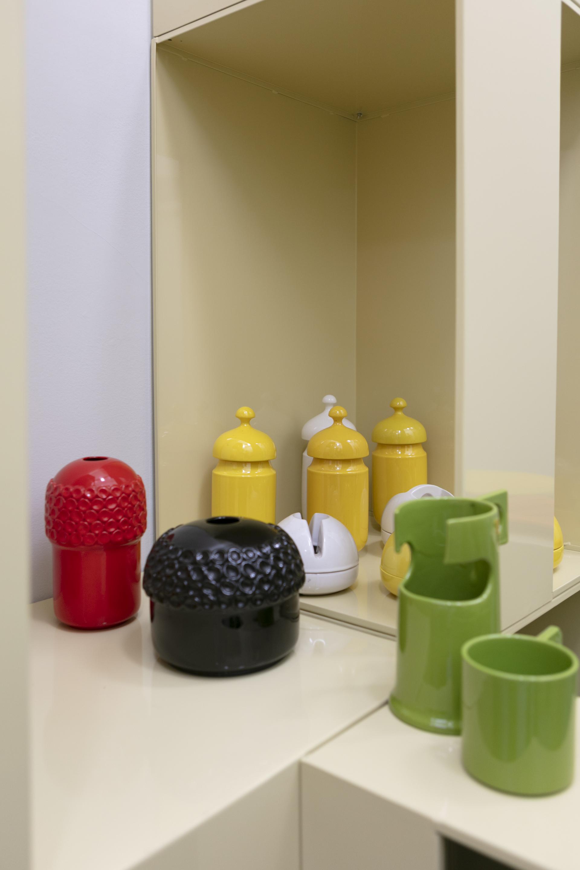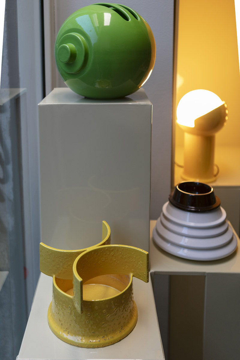 La mostra IL BATTITO DEL PICCHIO. Il fantastico mondo delle ceramiche di Enzo dà dunque spazio alla produzione ceramica di Bioli: lampade, fioriere, salvadanai, vasi, portacenere, tazze, piatti, tutti oggetti che rispondono a un linguaggio coerente e riconoscibile, fondato sulla componibilità e sulla modularità, e dunque pensati per dialogare tra loro più che per imporsi come pezzi isolati. Lo stile di Bioli guarda al futuro senza perdere il legame con la quotidianità: le sue forme “space age”, fatte di semisfere lucide, bocche circolari e basi troncoconiche, testimoniano l’interesse per un immaginario internazionale reinterpretato con grande naturalezza nei materiali ceramici. I gres e gli smalti pieni – arancione, blu oltremare, nero lucido – conferiscono agli oggetti una presenza intensa, capace di resistere nel tempo e di adattarsi tanto alla luce di una vetrina quanto all’atmosfera domestica di un salotto.