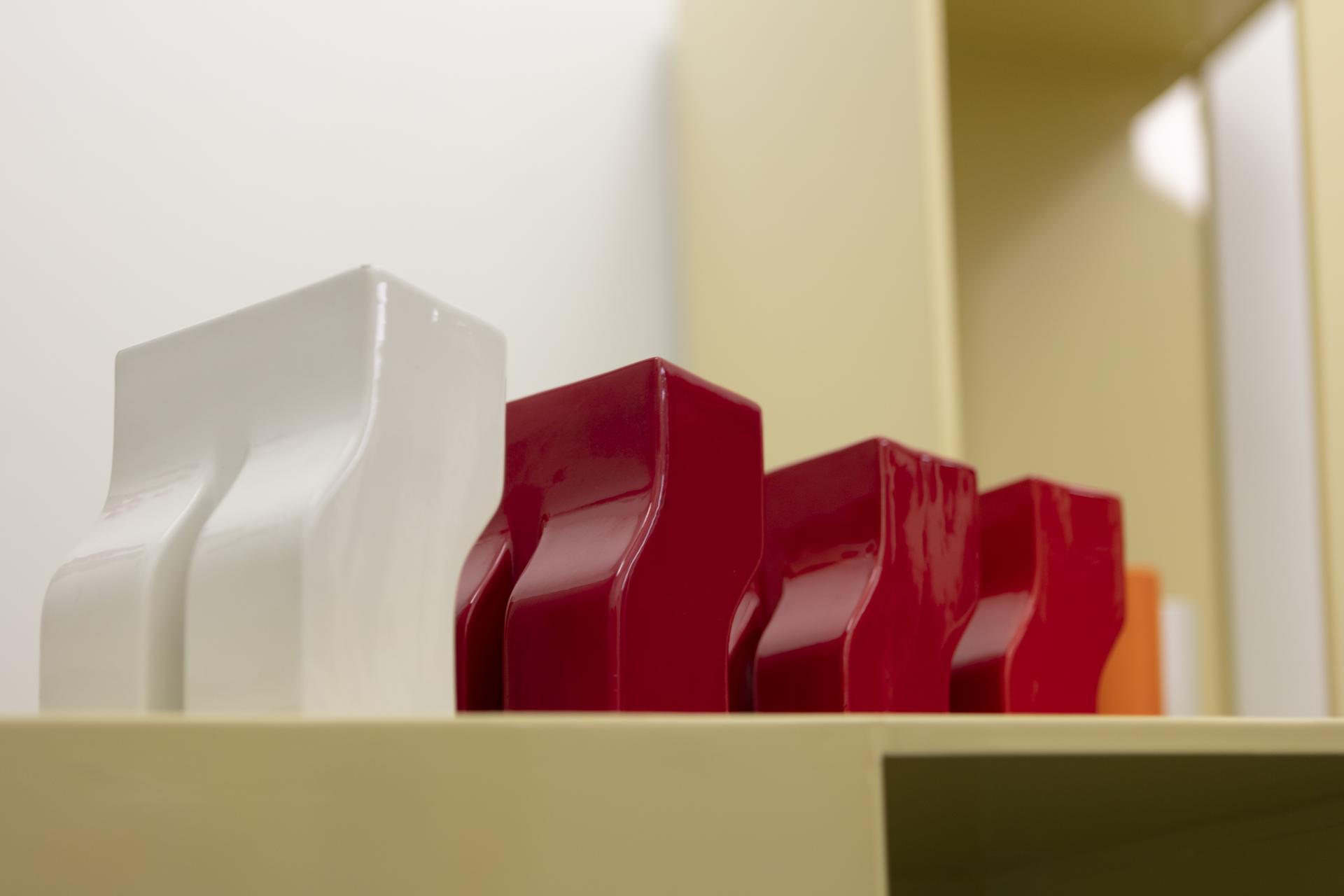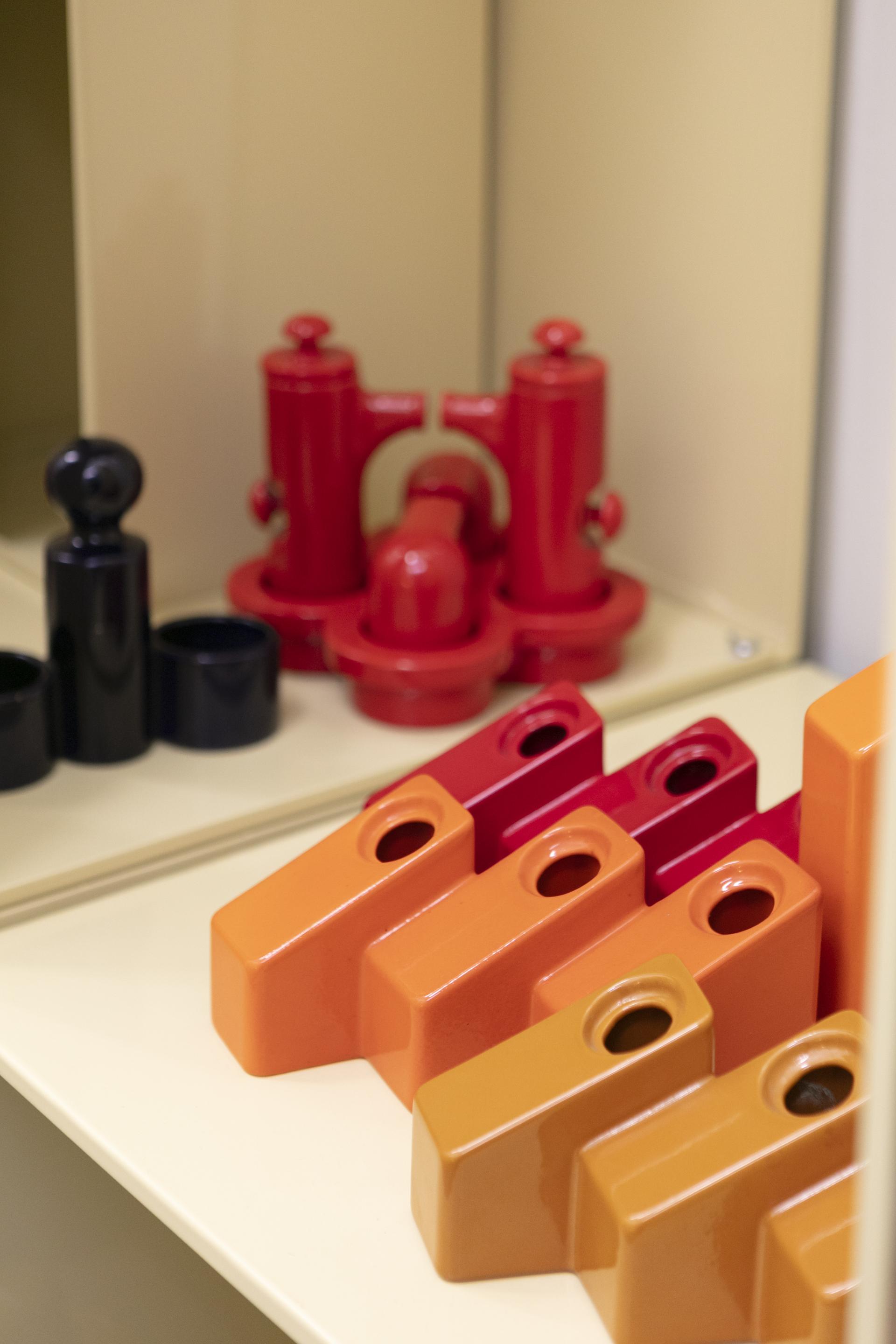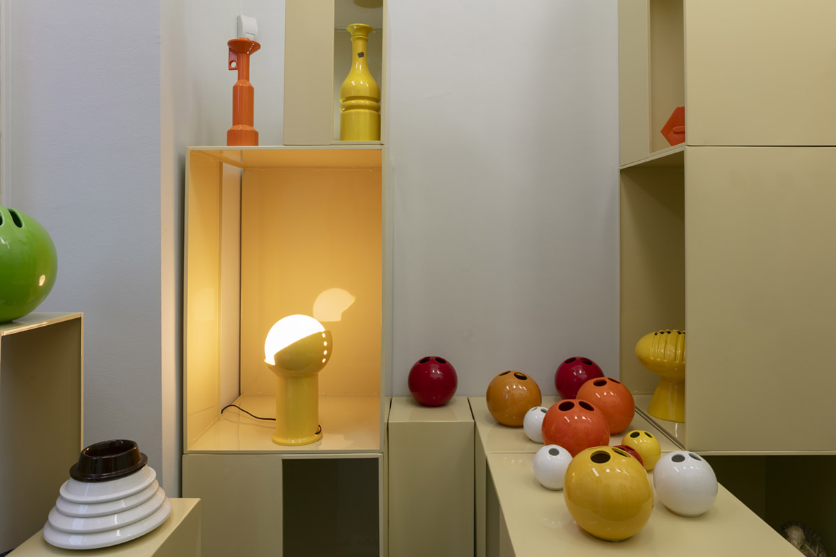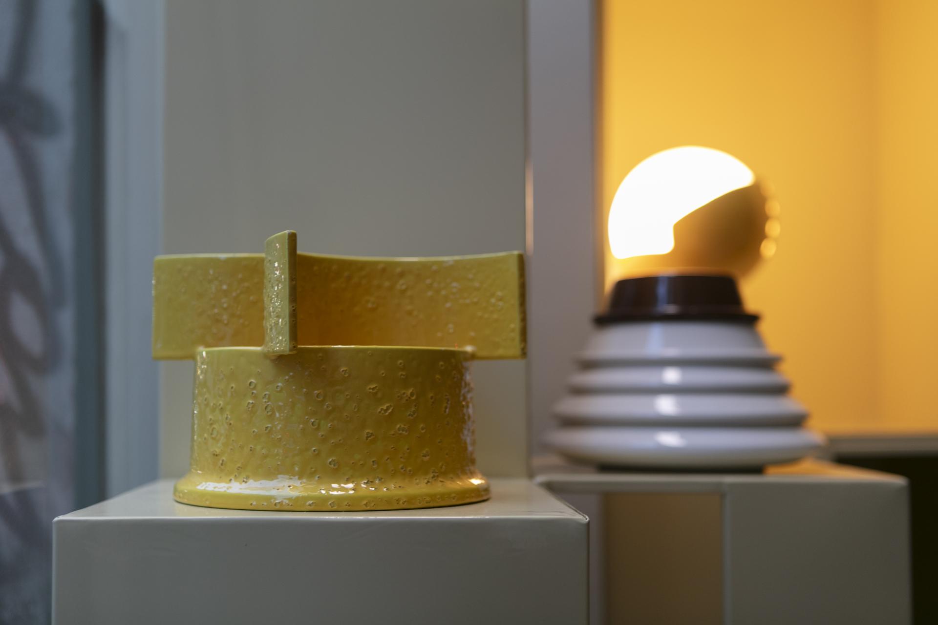 La mostra IL BATTITO DEL PICCHIO. Il fantastico mondo delle ceramiche di Enzo dà dunque spazio alla produzione ceramica di Bioli: lampade, fioriere, salvadanai, vasi, portacenere, tazze, piatti, tutti oggetti che rispondono a un linguaggio coerente e riconoscibile, fondato sulla componibilità e sulla modularità, e dunque pensati per dialogare tra loro più che per imporsi come pezzi isolati. Lo stile di Bioli guarda al futuro senza perdere il legame con la quotidianità: le sue forme “space age”, fatte di semisfere lucide, bocche circolari e basi troncoconiche, testimoniano l’interesse per un immaginario internazionale reinterpretato con grande naturalezza nei materiali ceramici. I gres e gli smalti pieni – arancione, blu oltremare, nero lucido – conferiscono agli oggetti una presenza intensa, capace di resistere nel tempo e di adattarsi tanto alla luce di una vetrina quanto all’atmosfera domestica di un salotto.