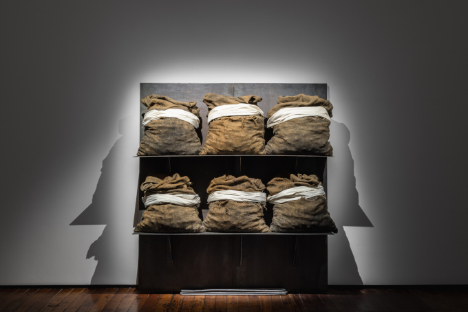 In Kounellis, questa tensione si manifesta attraverso un’estetica della materia che incorpora gli oggetti del lavoro, i materiali poveri, gli elementi primari: ferro, carbone, lana, sacchi di iuta, fiamme. La sua è una liturgia laica, anzi materialista, un rito tragico in cui il dolore del mondo trova espressione nella materia stessa. Alla Galleria Fumagalli sono esposte alcune delle sue opere, strutture in ferro su cui poggiano ora sacchi pieni di carbone, ora cappotti compressi, ora capelli trafitti da lame: oggetti veri che portano la traccia dell’esistenza umana, della sua quotidianità e delle sue fatiche.