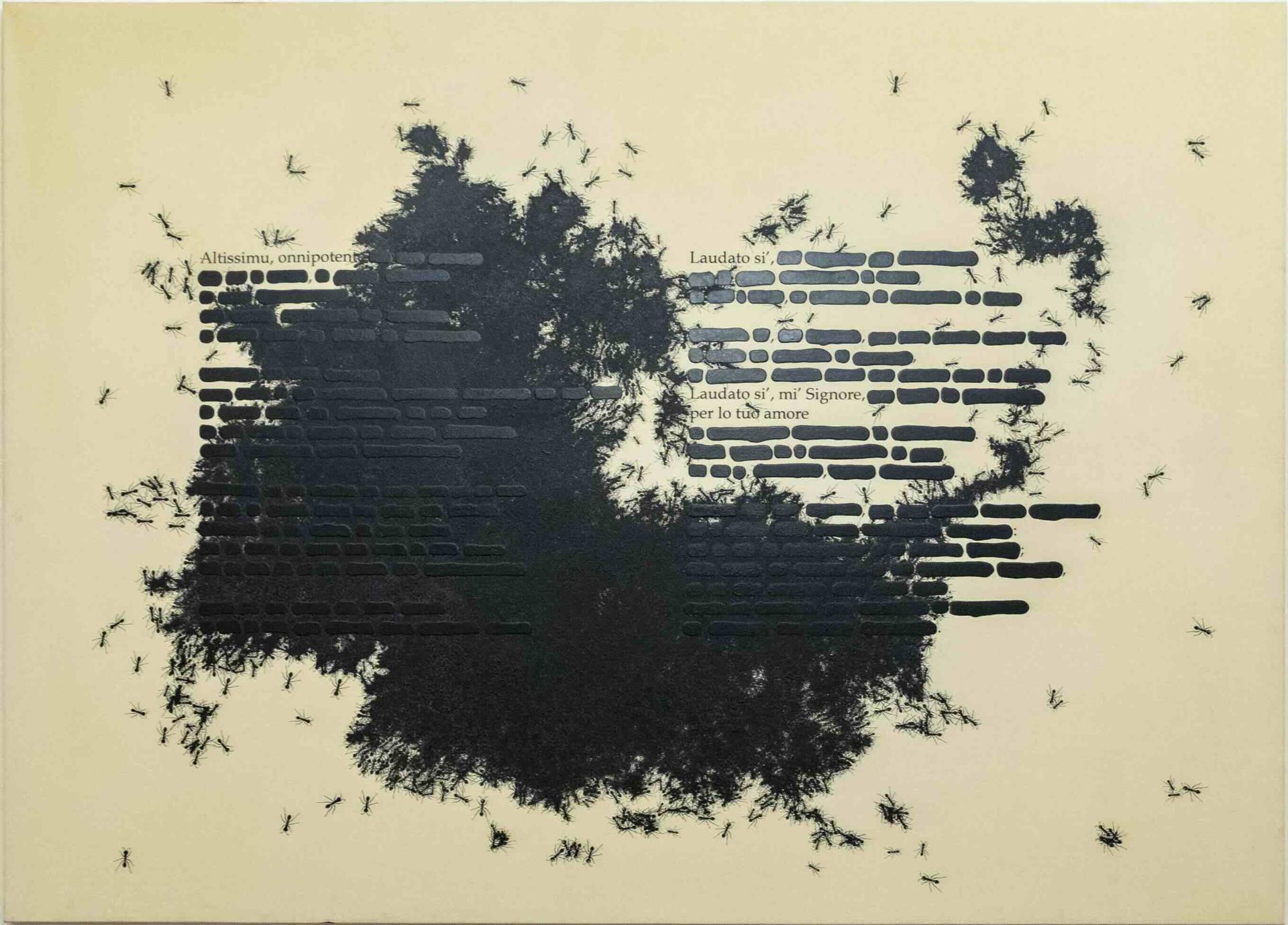 L’ormai celebre Venere degli stracci di Michelangelo Pistoletto è una riflessione sull’equilibrio tra natura e artificio presente; Emilio Isgrò si è confrontato direttamente con il Santo, applicando le sue note cancellature concettuali, che non vietano o distruggono ma proteggono le parole, anche al Cantico delle Creature; come pure il dittico In Lumine Dei di Omar Galliani è un omaggio diretto al Cantico, inciso sulla superficie dorata di una delle due tavole a cui si accosta una figura di donna di spalle in un’ opera che si interroga sull’esperienza del divino e in cui, come nel dettato francescano, la luce non è oggetto di contemplazione, ma presenza diffusa che attraversa ogni forma del vivente, rendendo il corpo spazio di risonanza, di accoglienza e di possibile manifestazione del sacro.