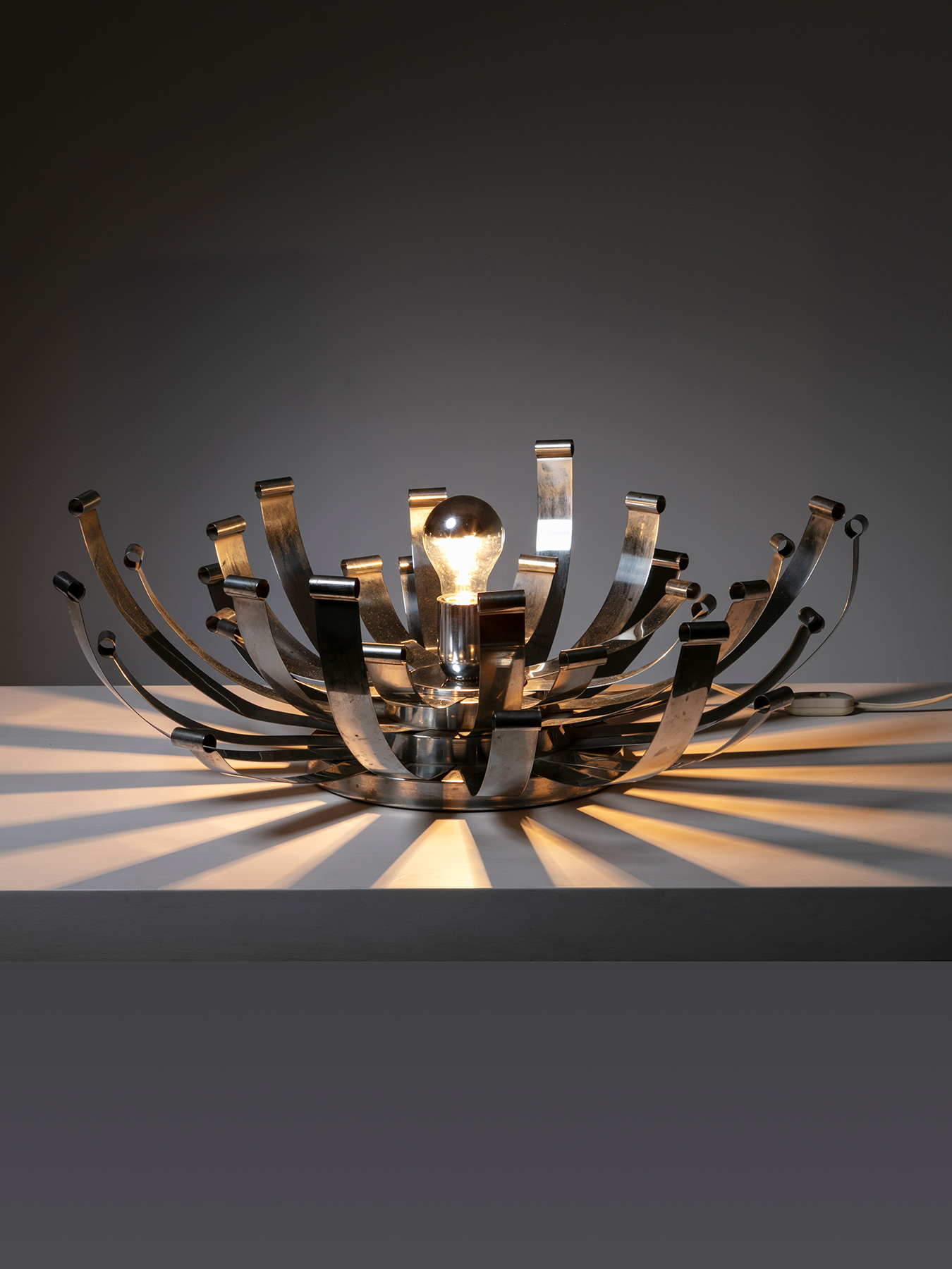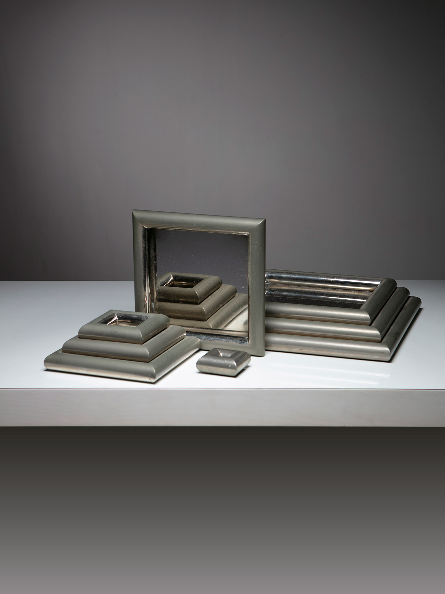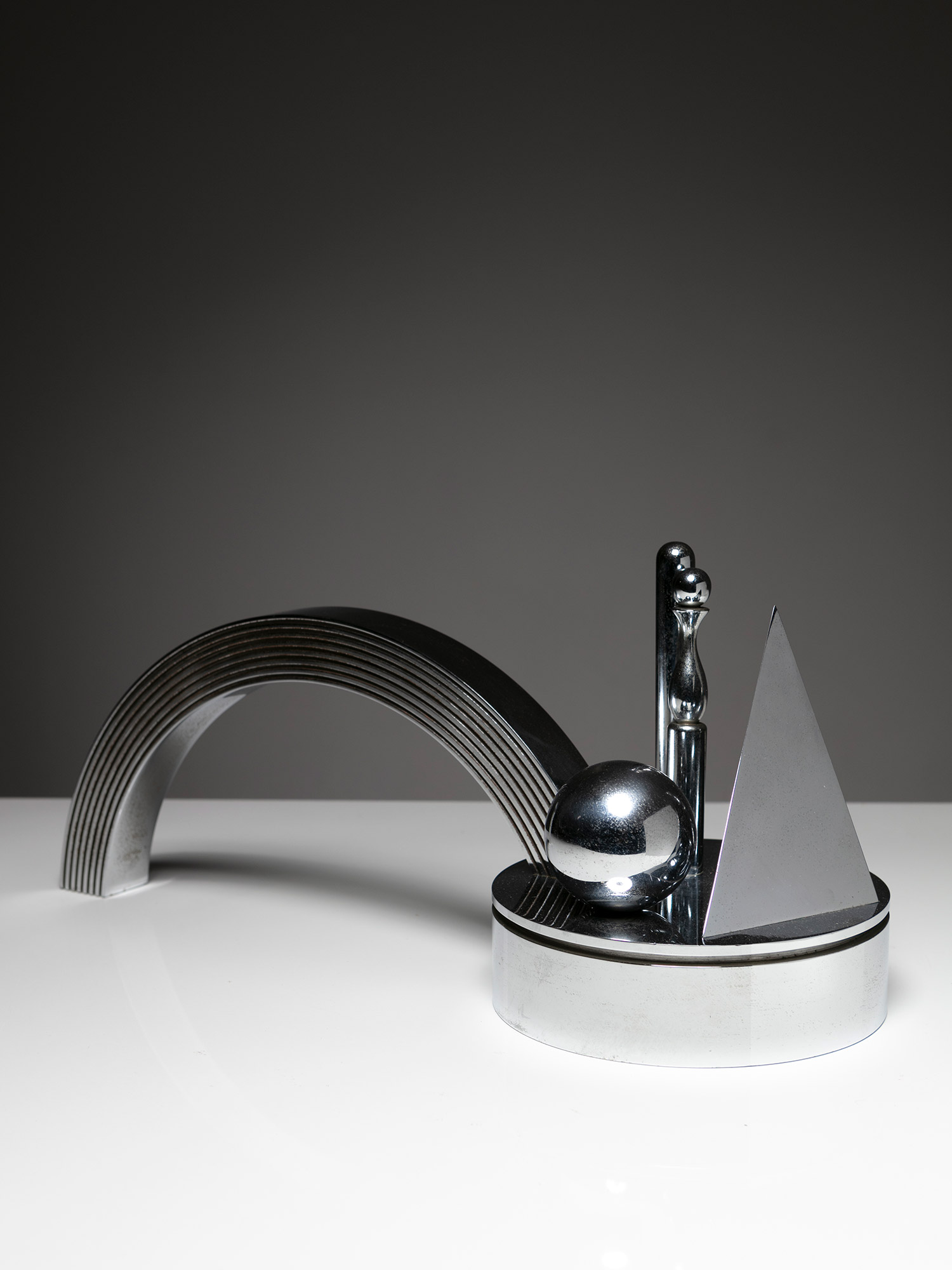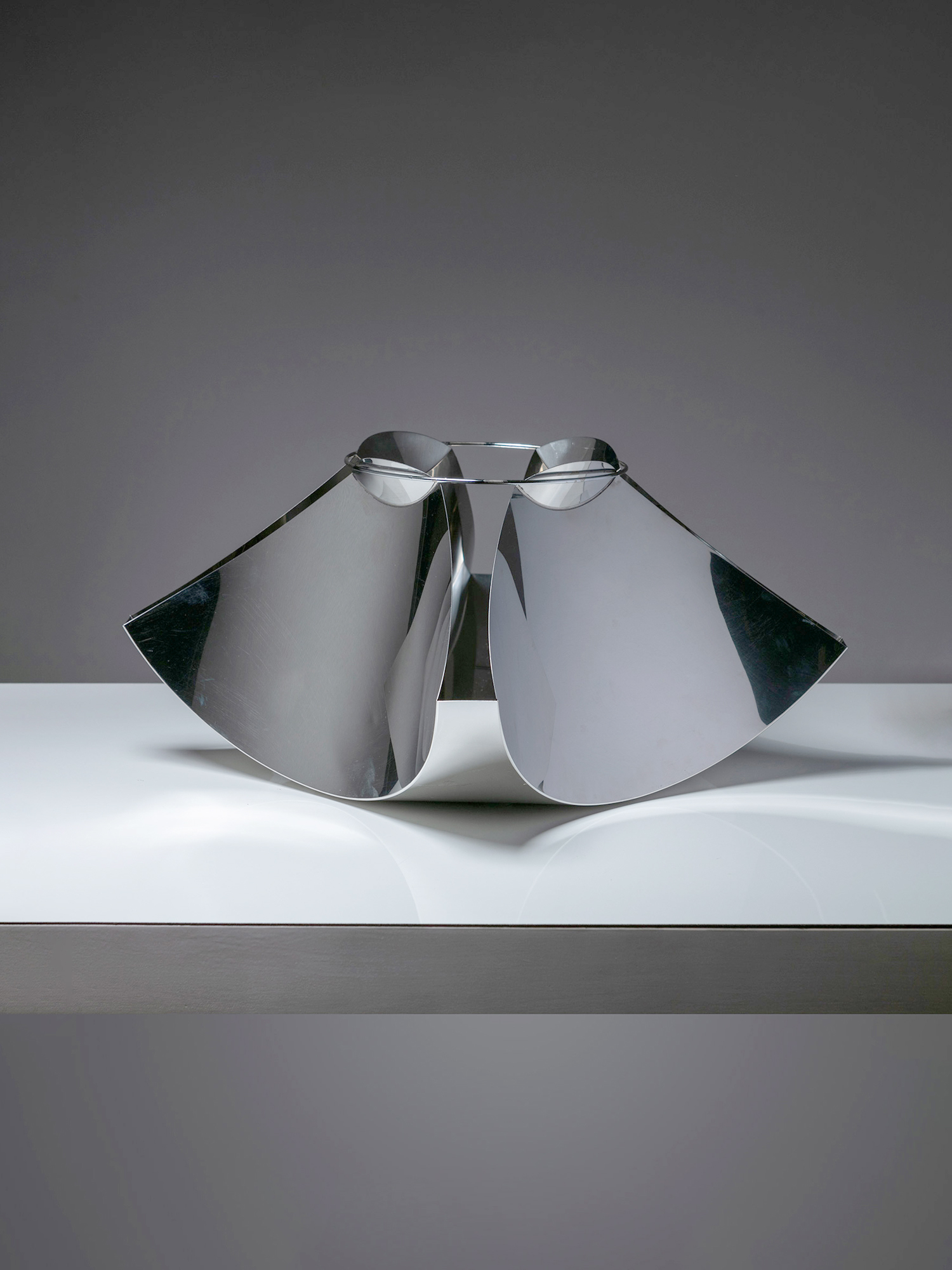 Alessandro Pedretti racconta l’allestimento dove la vicinanza tra l’alpacca satinata di un vassoio di Bruno Munari e l’acciaio inossidabile lucidato di un porta foglietti di Enzo Mari, tra un metallo argentato di un candeliere di Lino Sabattini ed un portacenere in acciaio cromato di Ico Parisi crea tra loro delle rifrazioni, pronte a cambiare e a scambiarsi nel corso della giornata, come si trattasse di un dimmer naturale che illumina la galleria.