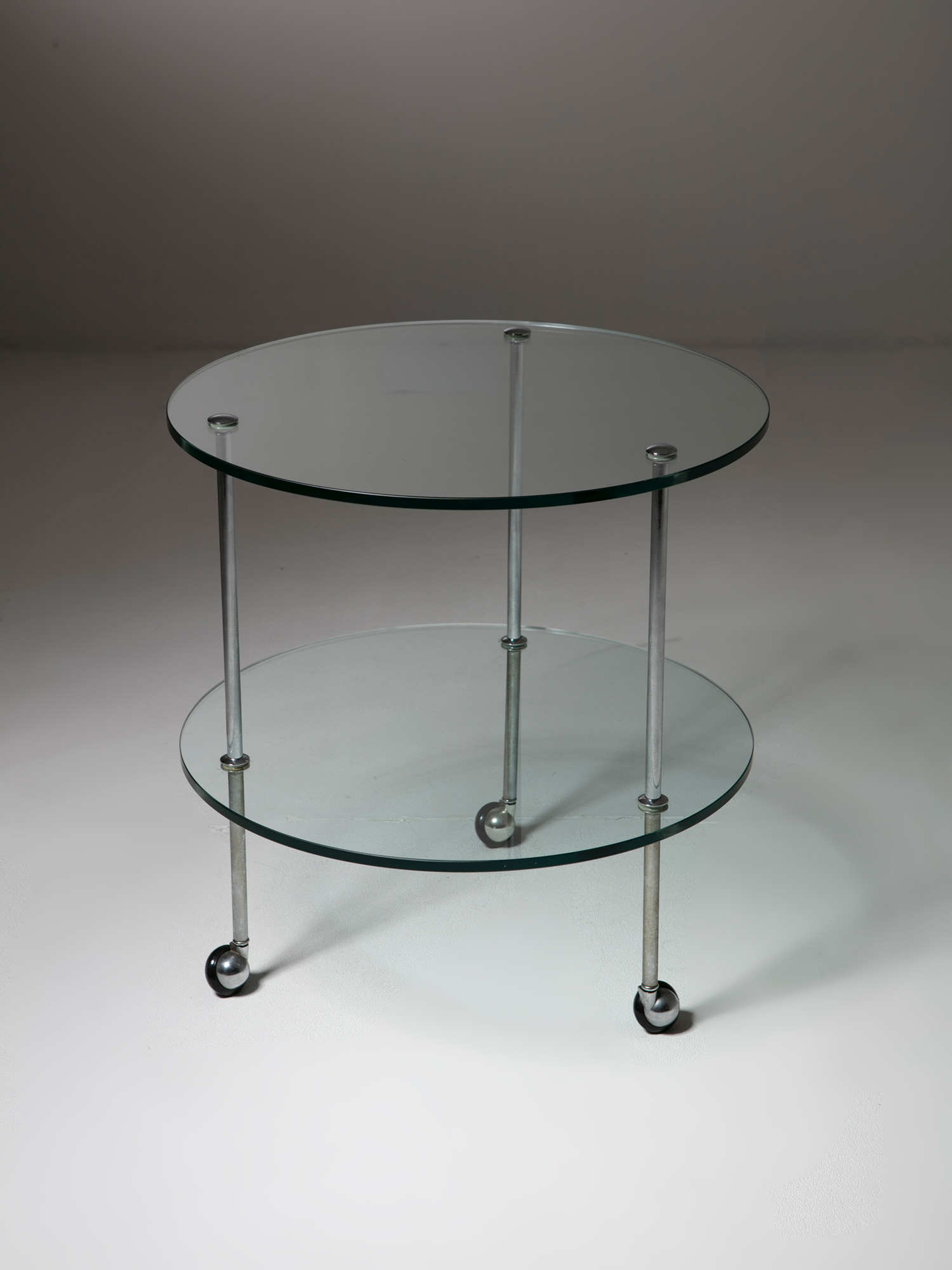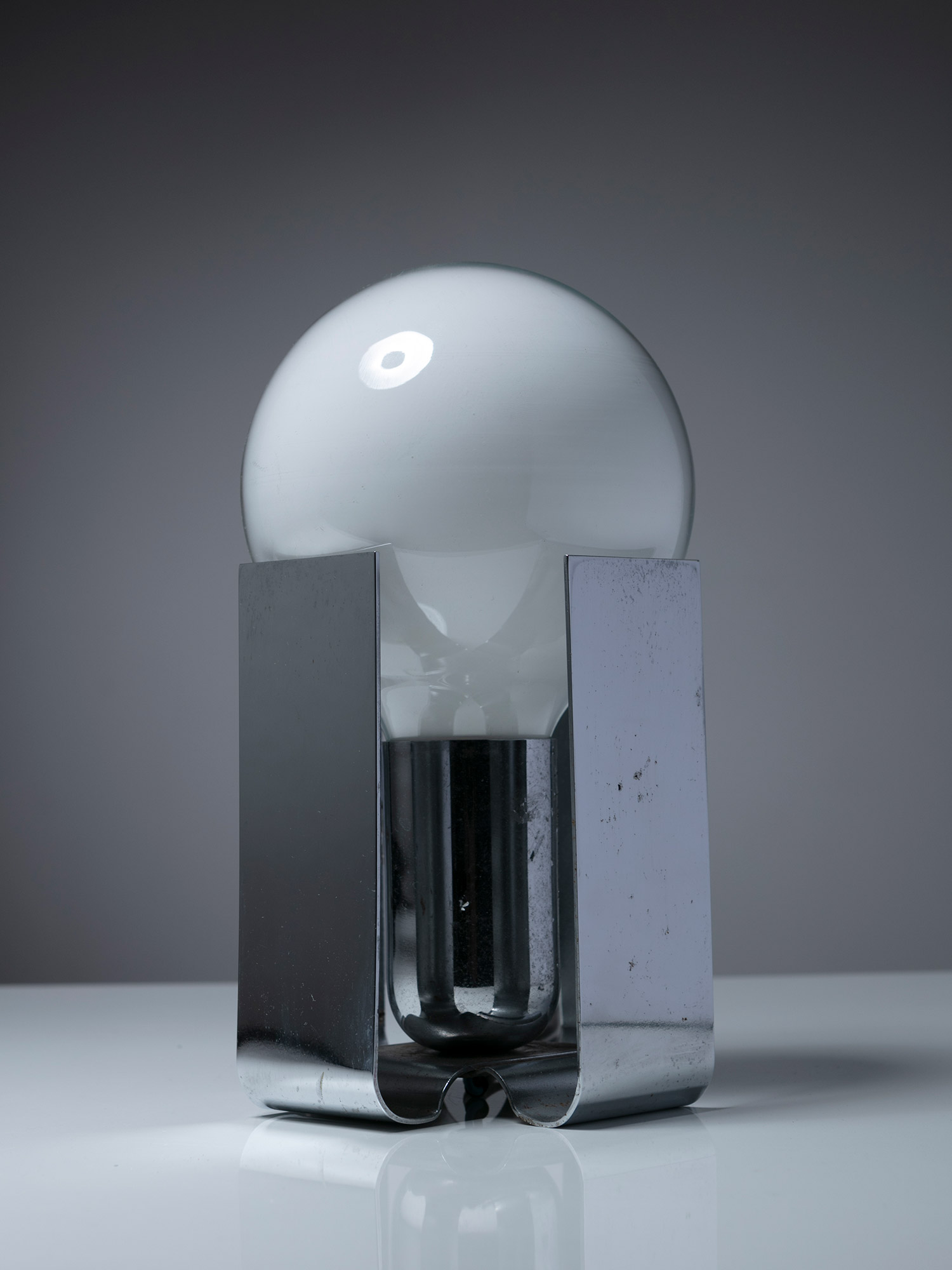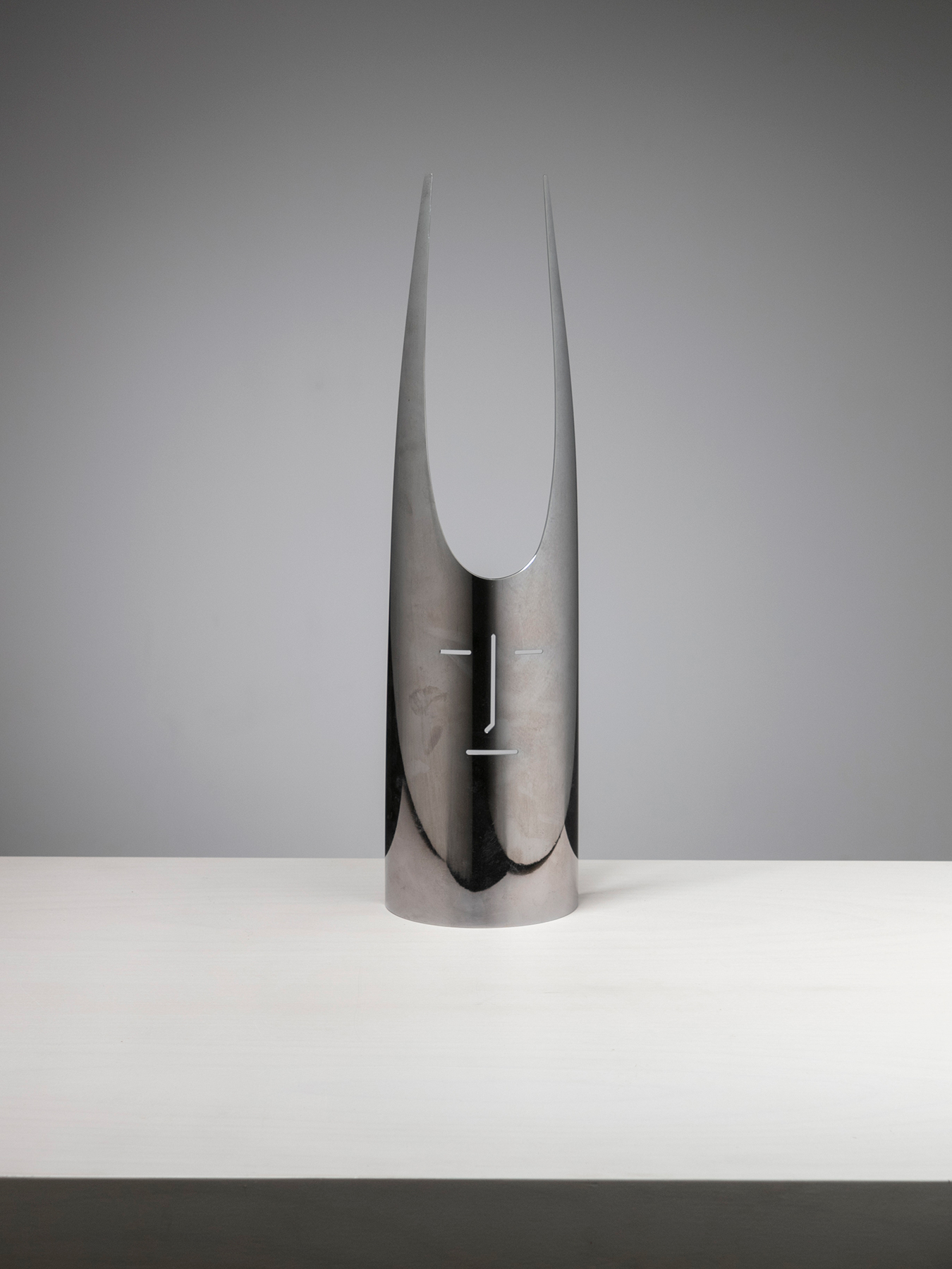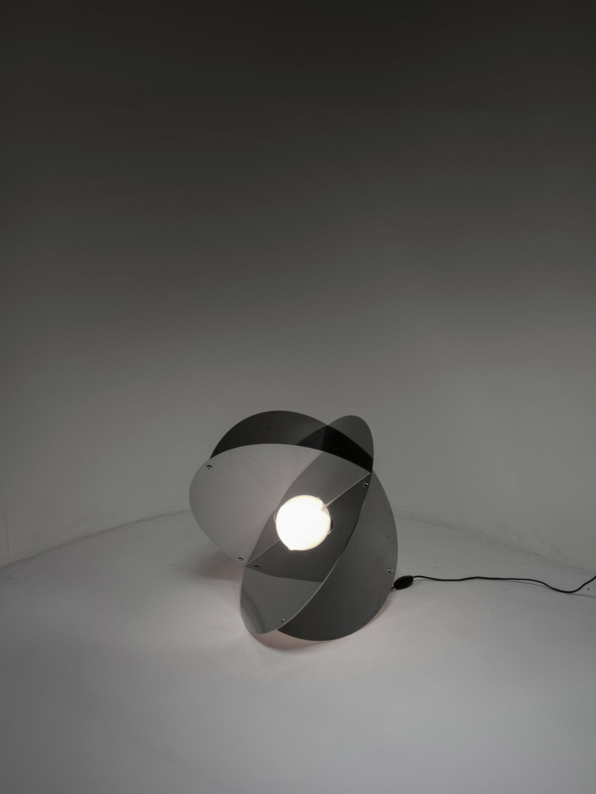 Alessandro Pedretti racconta l’allestimento dove la vicinanza tra l’alpacca satinata di un vassoio di Bruno Munari e l’acciaio inossidabile lucidato di un porta foglietti di Enzo Mari, tra un metallo argentato di un candeliere di Lino Sabattini ed un portacenere in acciaio cromato di Ico Parisi crea tra loro delle rifrazioni, pronte a cambiare e a scambiarsi nel corso della giornata, come si trattasse di un dimmer naturale che illumina la galleria.